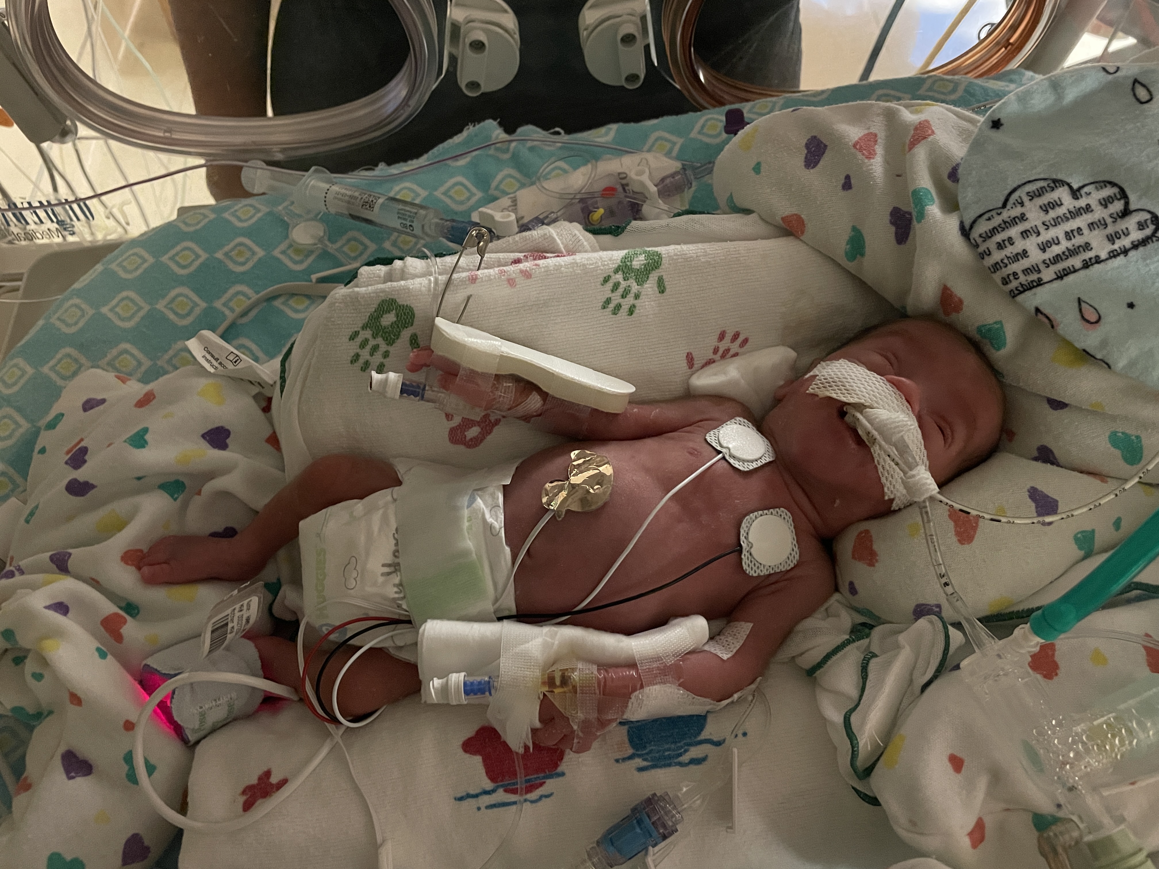 With his next increase of feed volume they’ll be able to wean him off the TPN (Total Parenteral Nutrition: a method of feeding that bypasses the gastrointestinal tract) and swap it for clear fluid made up of dextrose and heparin…