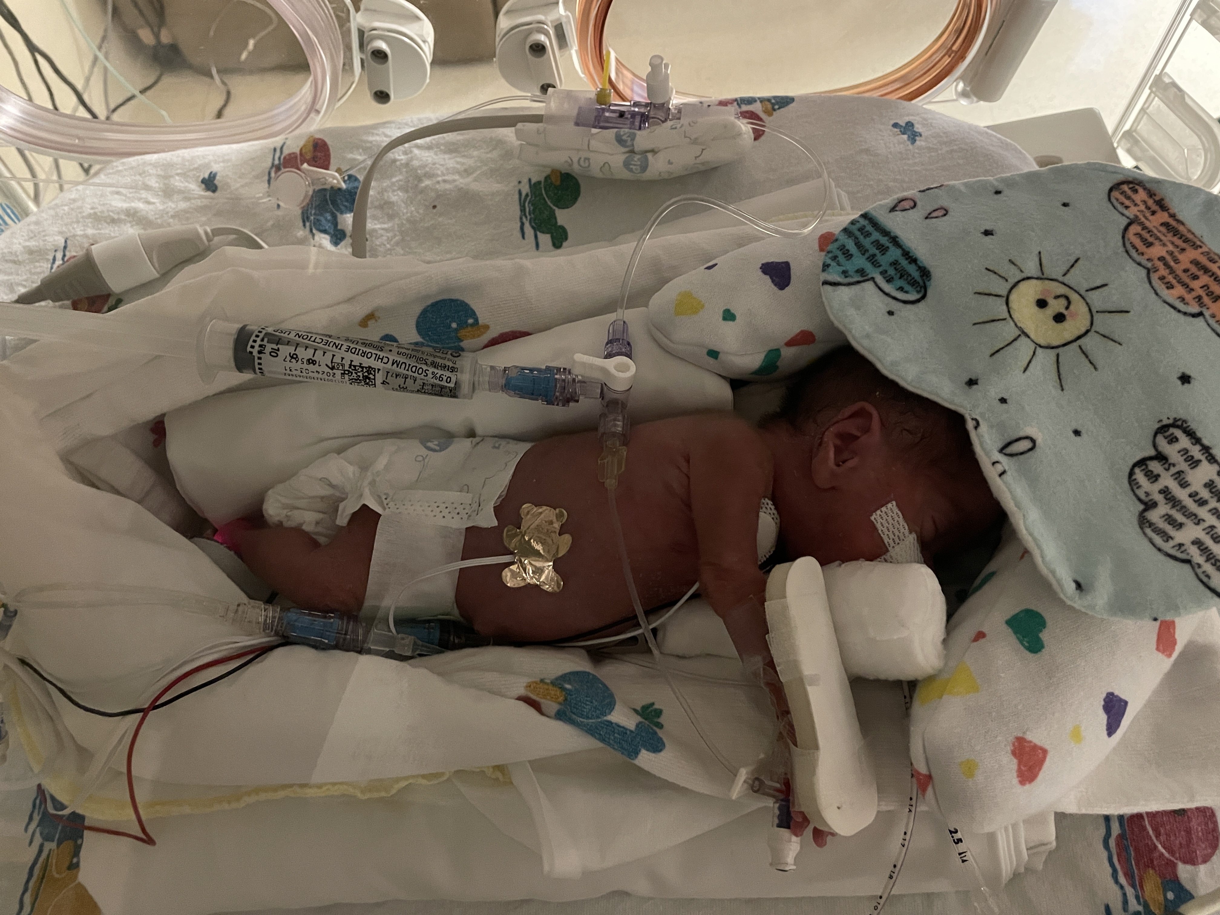 His feedings have been increased to 4mL/hr. He’s currently laying on his belly, his favorite position 🙂
