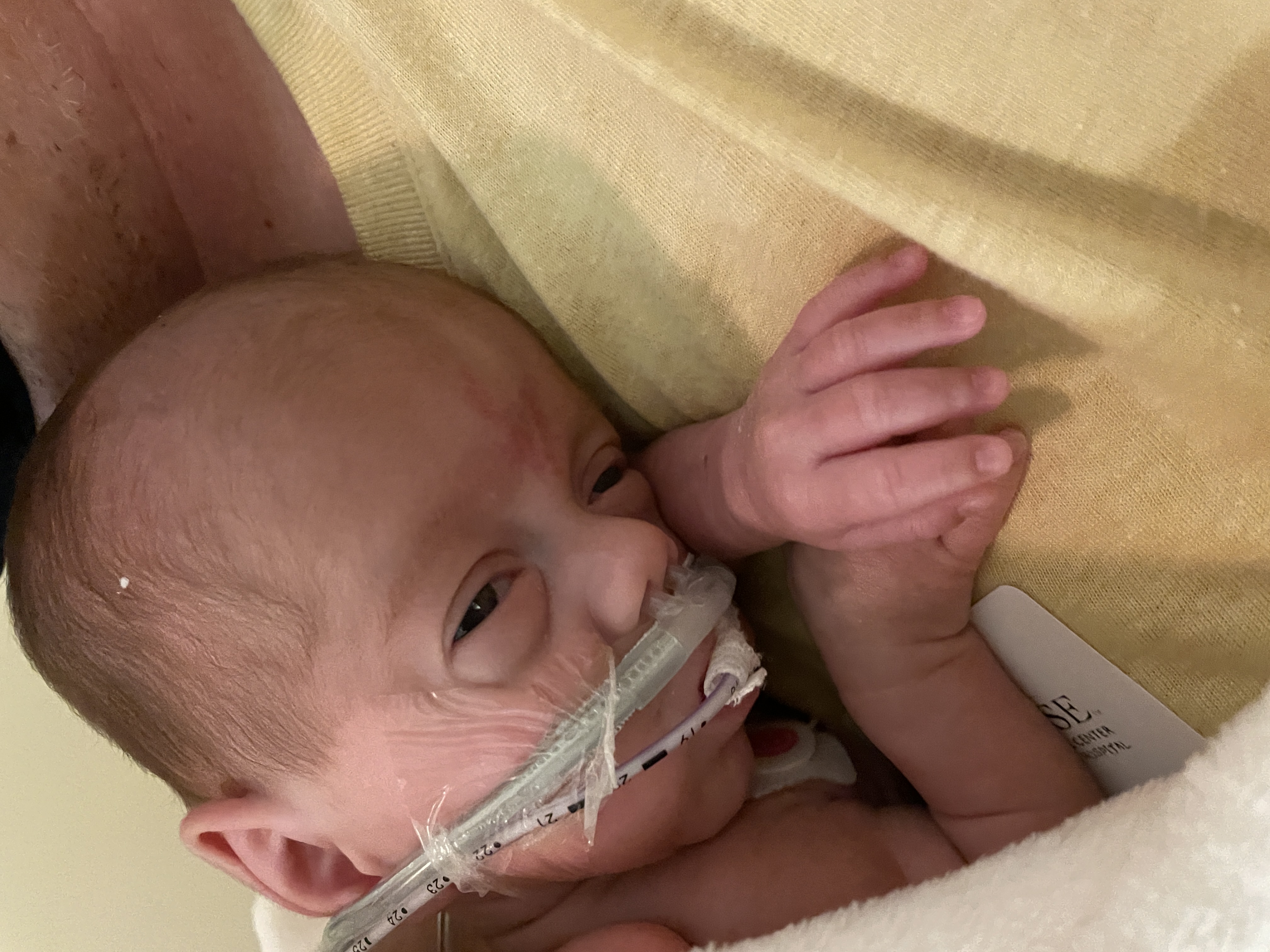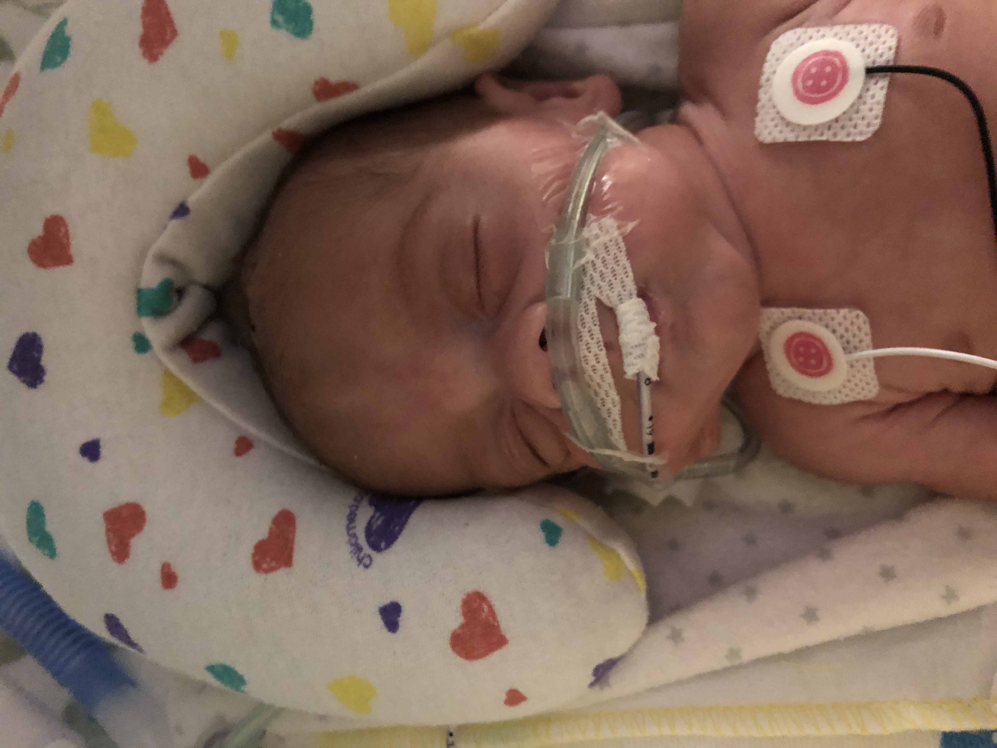 Asher is officially a Hi Flow O2 baby! He is breathing ON HIS OWN! The next process is to wean the flow of oxygen down from 2L/min, down to 1.5L/min, down to 1L/min. At the point of weaning lower than 1L/min they’ll make a decision to go down either .5L/min or just room air…